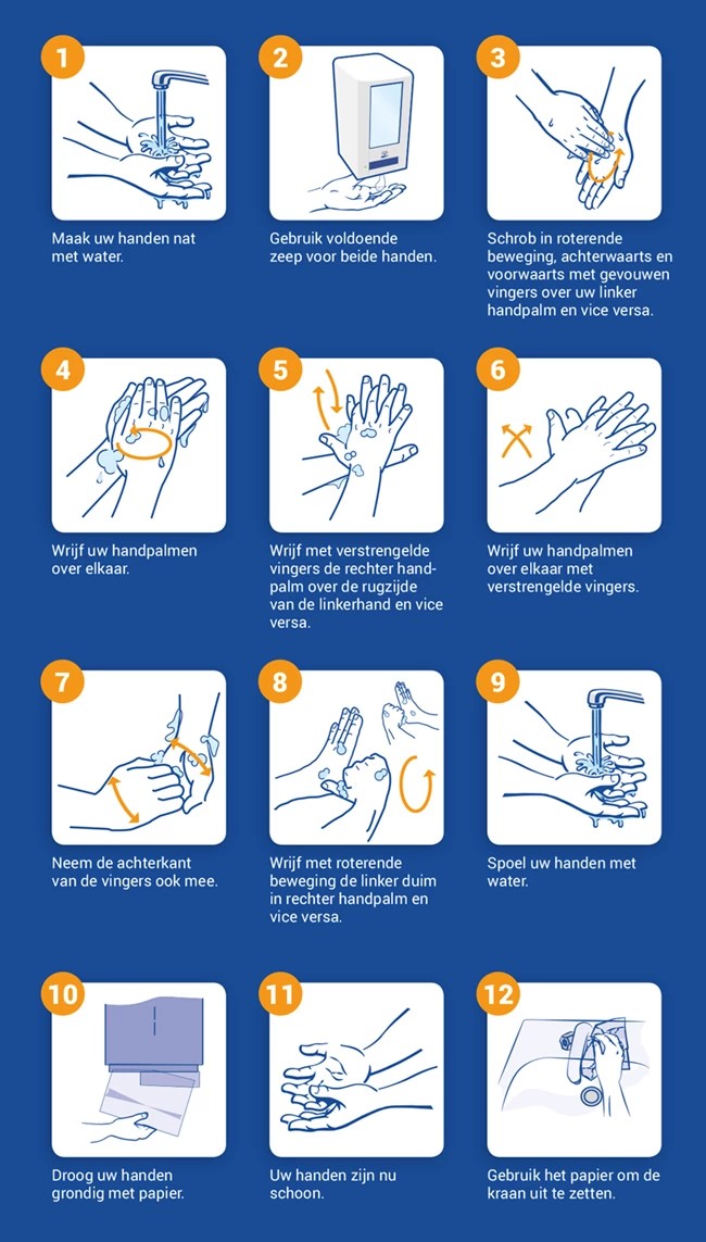 Twijfelt u of u zeep of handalcohol moet gebruiken? Kies dan voor zeep. Handen wassen met water en zeep is voor iedere situatie een correcte vorm van handreiniging. Belangrijk: was uw handen ongeveer een minuut lang en droog ze daarna af met een papieren handdoek. Dit zijn de gedetailleerde instructies: