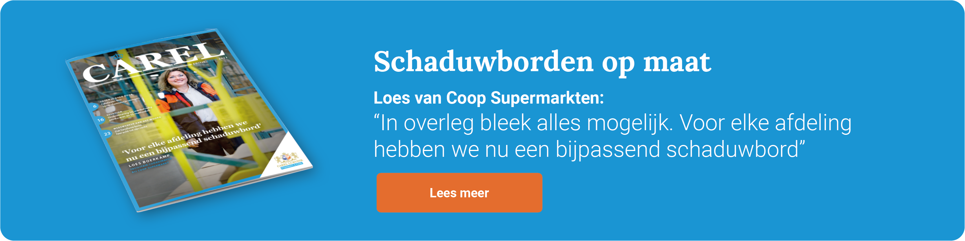 Supermarktketen Coop gebruikt al jaren schoonmaakmaterialen en PBM’s van Carel Lurvink. In 2022 wilden ze voor het distributiecentrum schaduwborden op maat laten maken. Aangepast aan de wensen en specifieke omstandigheden van elke afdeling. Loes Boerkamp, Facilitair Coördinator: “In overleg bleek alles mogelijk. Zelfs transparante borden voor de productomgeving.” Lees hier het hele interview met Loes.