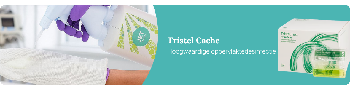 Tristel Jet en Tristel Fuse zijn professionele desinfectiemiddelen speciaal ontwikkeld voor gebruik in zorgomgevingen, zoals ziekenhuizen, laboratoria en verpleeghuizen. Deze middelen zijn geschikt voor het desinfecteren van oppervlakken en laten geen schadelijke residuen achter. Beide desinfectiemiddelen zijn werkzaam tegen bacteriën, virussen, schimmels en sporen. Tristel Jet is een kant-en-klare desinfectiespray en heeft een contacttijd van 1 minuut. Tristel Fuse is ideaal voor het desinfecteren van grotere oppervlakken en heeft een contacttijd van 5 minuten.