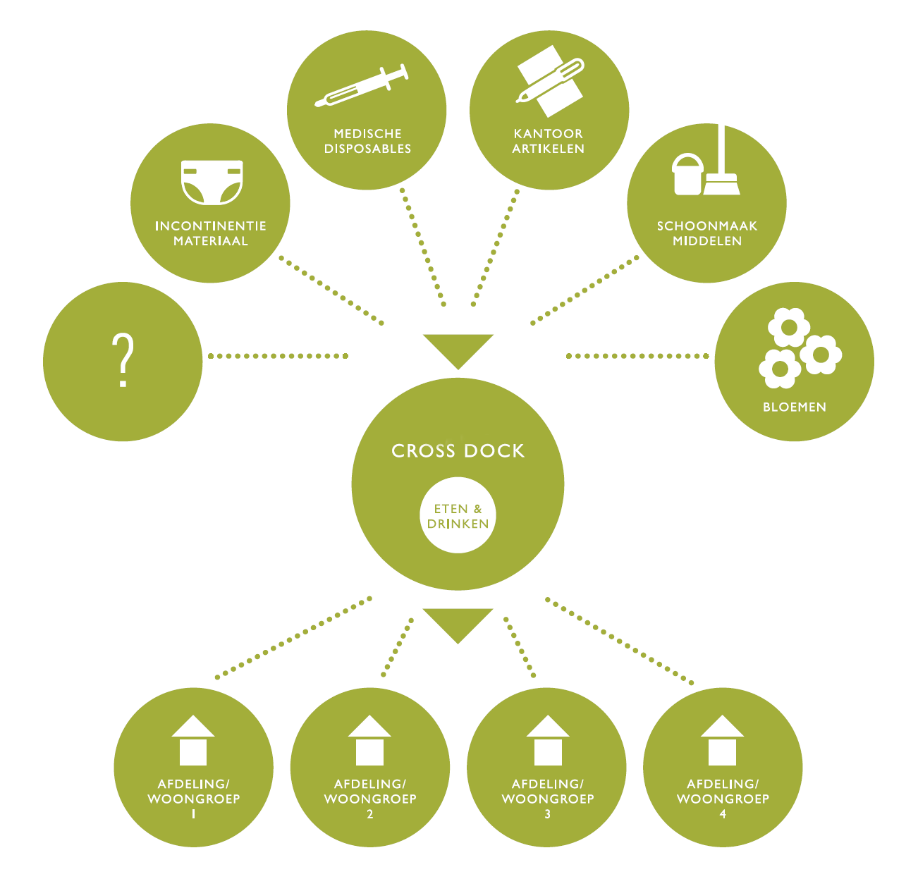 Wij zijn onderdeel van het Cross & Care Logistics concept van Lucrum. Bestellingen van meerdere leveranciers worden gebundeld en in één levering op afdelingsniveau bij zorginstellingen afgeleverd. Als zorginstelling kunt u rechtstreeks bij ons blijven bestellen. Wij leveren deze artikelen op één van de distributiecentra van Lucrum en zij zorgen voor het sorteren en afleveren op afdelingsniveau bij uw organisatie.